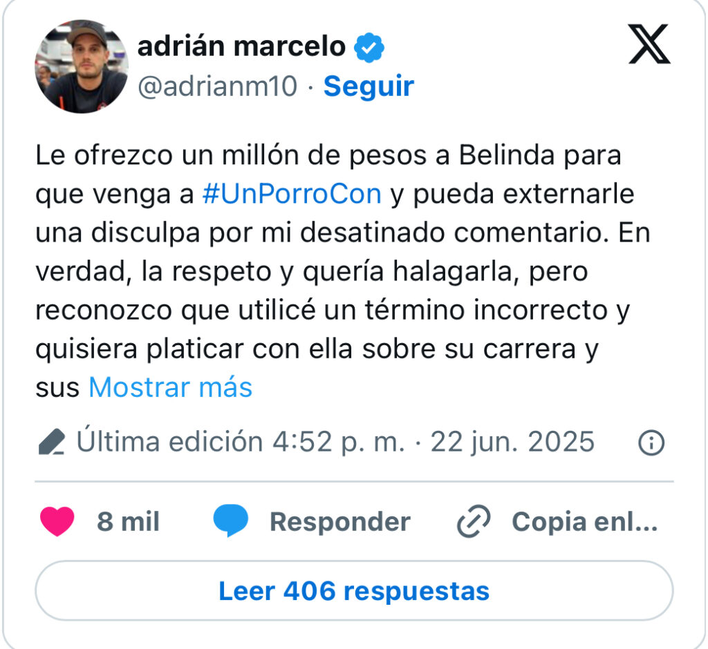 Ante la ola de reacciones negativas, Adrián Marcelo decidió responder a la polémica y ofrecer una disculpa pública a Belinda, aunque lo hizo de una manera que volvió a generar comentarios divididos. A través de sus redes sociales, publicó el siguiente mensaje: