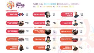 La administración a cargo del Presidente Municipal Cruz Pérez Cuéllar, a través de la Dirección de Protección Civil, dio a conocer la cartelera artística, las variedades, los precios y las medidas sanitarias que se llevarán a cabo del 23 de septiembre al 10 de octubre del 2021 en la Plaza de la Mexicanidad de Ciudad Juárez, Chihuahua.