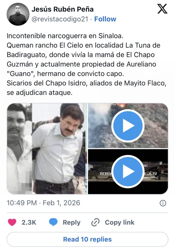 La tarde de este domingo 1 de febrero, comenzó a circular el video del incendio del rancho «El Cielo», ubicado la localidad de La Tuna, municipio de Badiraguato, Sinaloa, y donde llegó a vivir la madre de «El Chapo» y «El Guano».