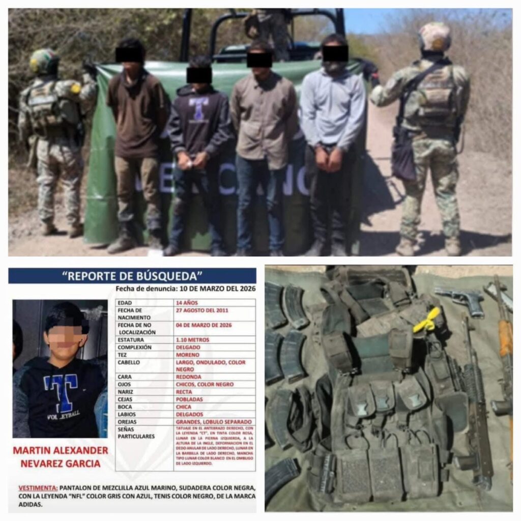 Un menor de 14 años de edad, identificado como Martín Alexander, quien había sido reportado como desaparecido el pasado 10 de marzo en la ciudad de Durango, fue localizado y detenido en el poblado La Elota, en el estado de Sinaloa, presuntamente participando en actividades delictivas junto a otros tres civiles armados.