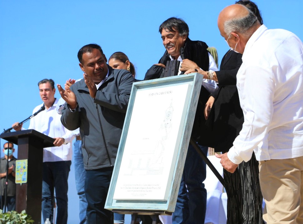 Luego de las intervenciones por parte de las autoridades, se llevó a cabo la develación de una obra artística, que consta de una copia en facsímil de los planos originales de construcción del Faro Viejo, la cual entregó el cronista de la ciudad Gabriel Fonseca Verdugo a la asociación Yenekamú, para que a su vez pueda exhibirse en instituciones educativas y museos de la entidad.