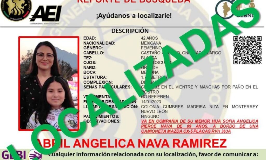La mujer desaparecida junto a su hija en la colonia Cumbres Madeira Niza, en Monterrey, fue localizada en compañía de su pequeña, según informaron las
